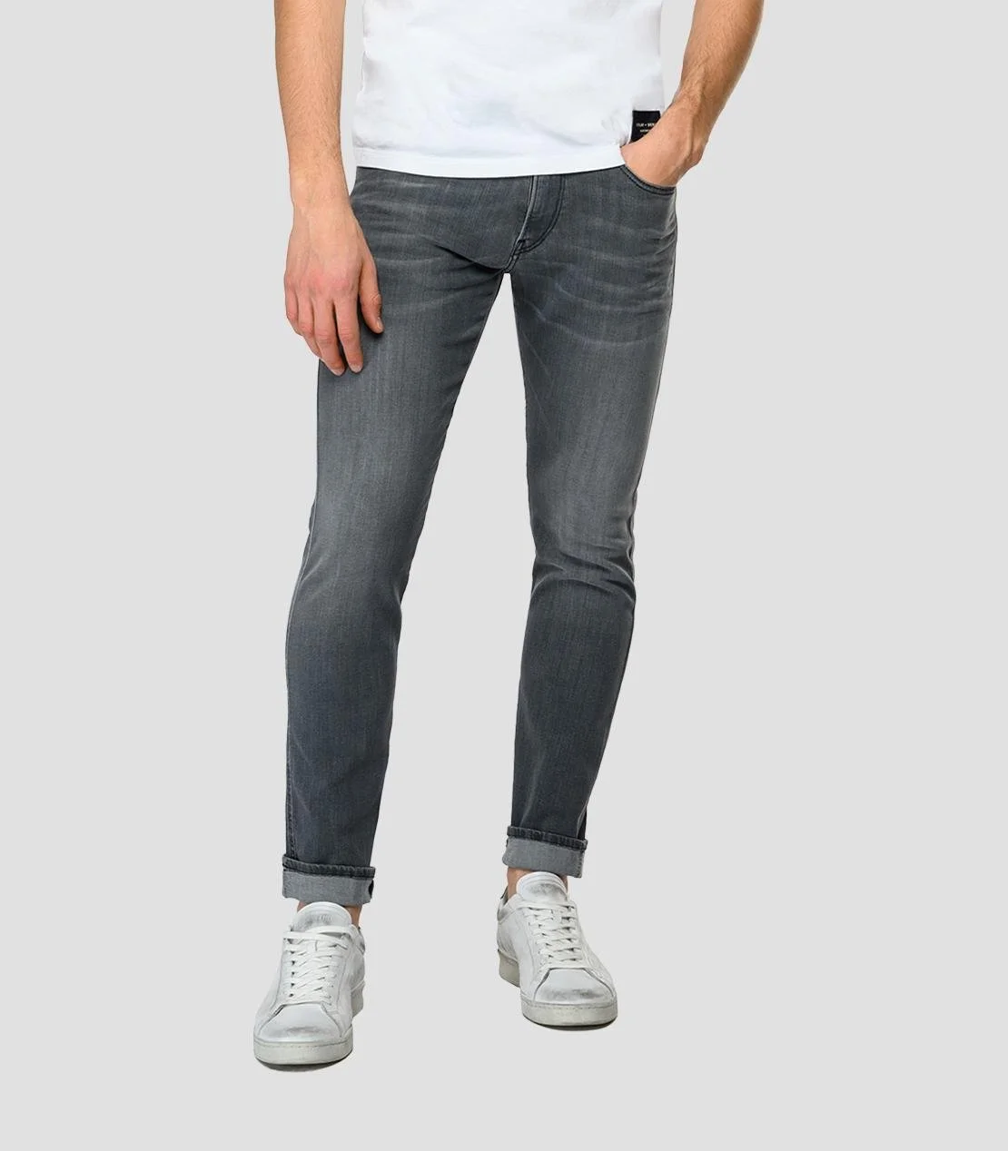 Men’s slim fit jeans in 10 oz black power stretch denim with a medium grey wash tone, regular waist and slightly tapered leg, handmade whiskers and scrapings, contrasts on more used areas and final 3D on mannequin, five pockets, triangle-shaped REPLAY label on the left pocket, coin pocket and back pockets with iconic gull stitching, R-shaped embroidery on the right back pocket, zip and button fly.